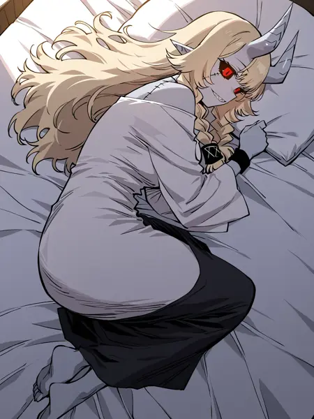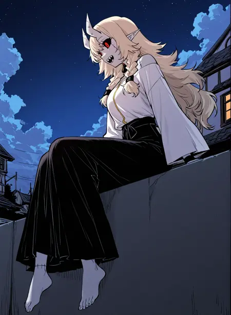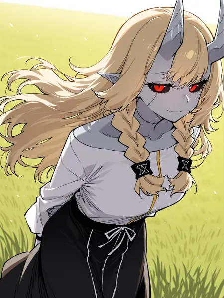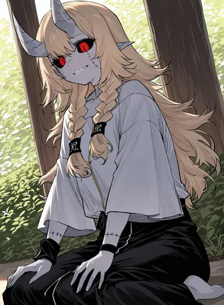 | 학습된 단어 | 1girl, solo, light gray skin, sharp teeth, fangs, black sclera, red eyes, slit pupils, blonde hair, long hair, wavy hair, bangs, twin braids, demon horns, gray horns, oni horns, stitched body, visible stitches, scarred body, pointed ears, demon girl, 복사됨! white top, long sleeves, loose sleeves, black skirt, long skirt, black pants, waistband, waist ornament, open sleeves, black wristband, white clothes, black and white outfit, barefoot복사됨! |
