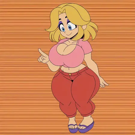 1人の少女、シングル、全身、若い女性、金髪、短い髪、額が露出、黒い眉毛、アイシャドウ、半閉じた目、青い目、笑顔、大きな胸、太ももが太い、足、素足、黒いタンクトップ、ピンクのショートパンツ(白のアクセント付き)