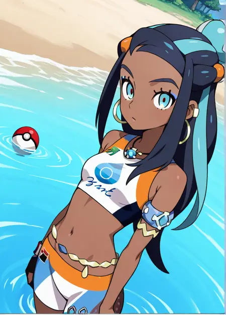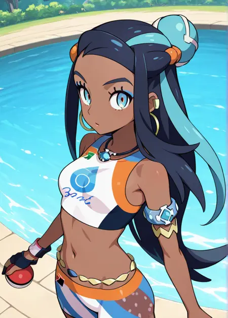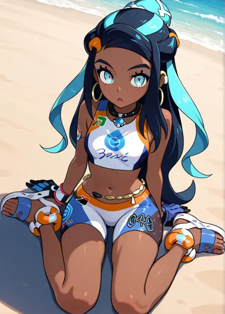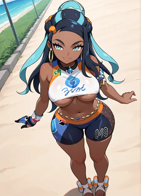 jewelry, crop top, earrings, single glove, gloves, navel, sandals, hoop earrings, armlet, midriff, bike shorts, dynamax band, swimsuit, belly chain,
