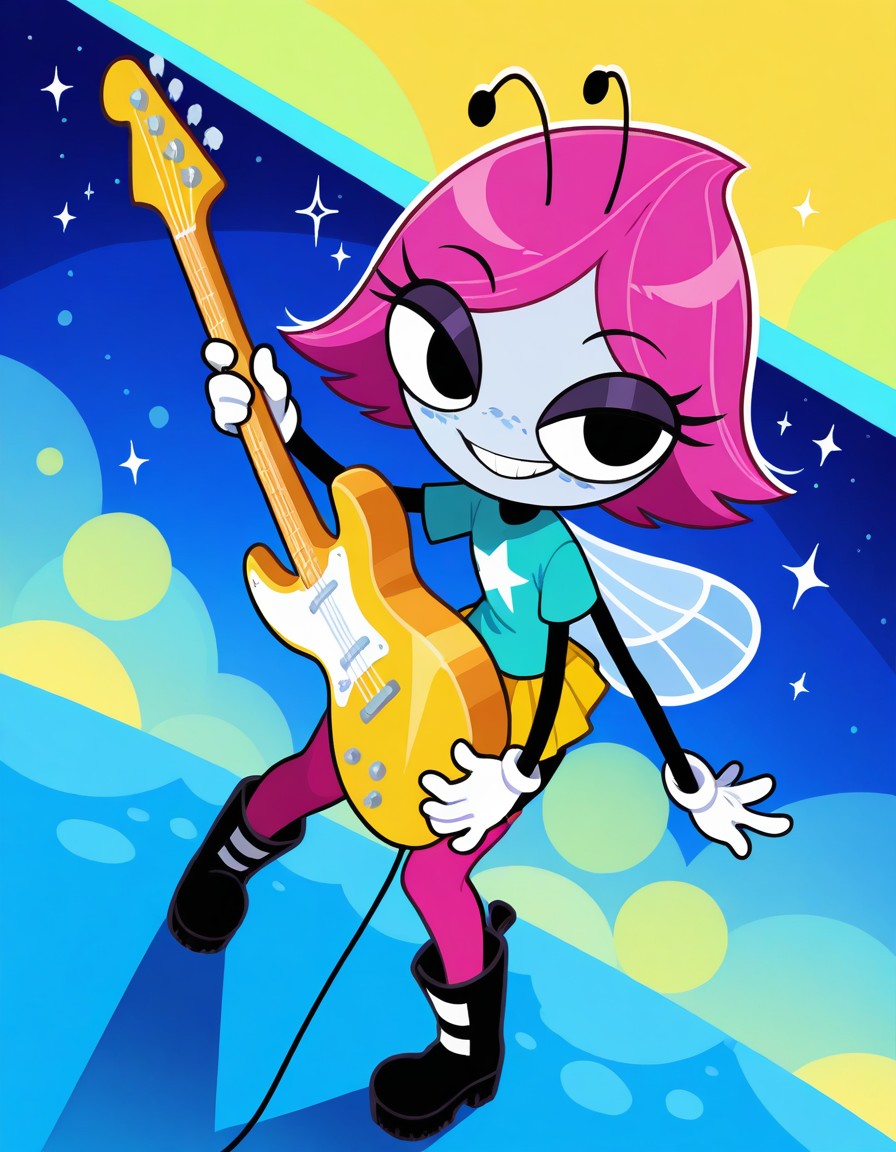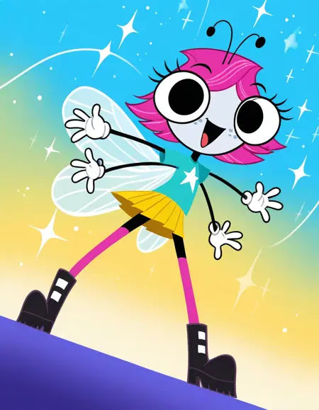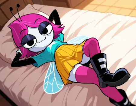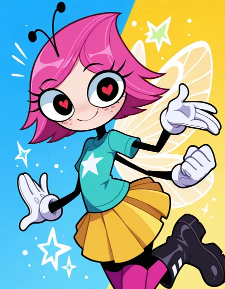 | 학습된 단어 | Maggie Pesky, arthropod girl, short hair, pink hair, freckles, yellow skirt, pleated skirt, aqua shirt, white star print, pink thighhighs, white gloves, short sleeves, wings, 4 arms, black eyes, eyelashes, black skin, antennae, insect wings, black boots,복사됨! |