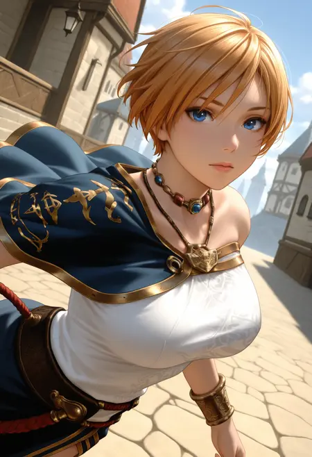 Leanna, blue eyes, short hair, asymmetrical top, dress, capelet, jewelry