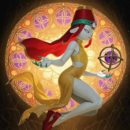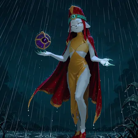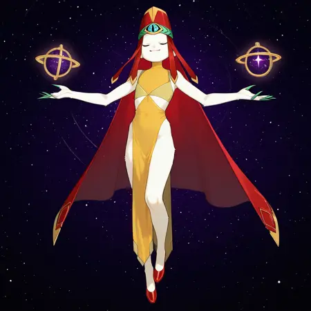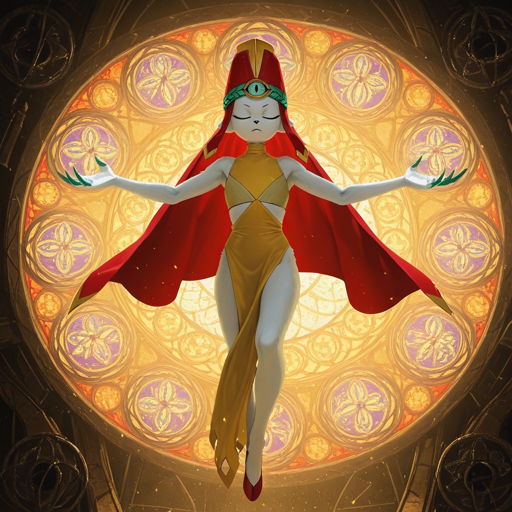 red hat, gold trim, tassels, eye on hat, jade decorations, veil, yellow dress, red shoes