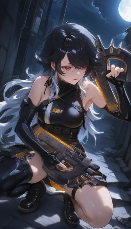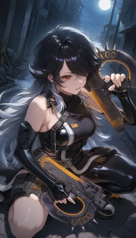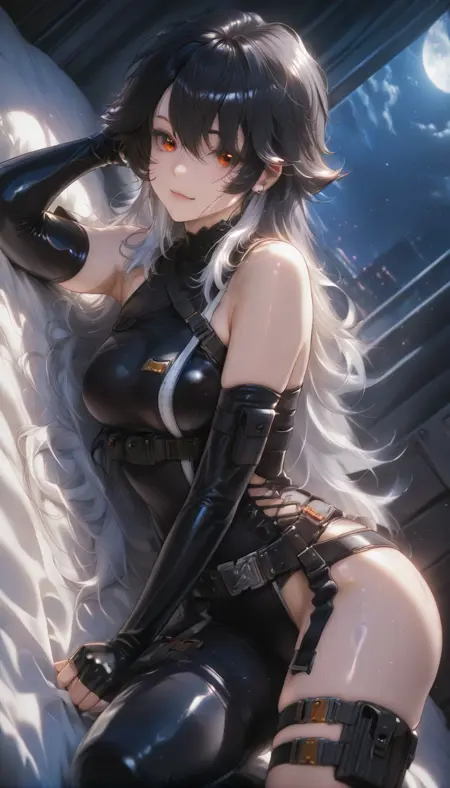 Nikke_K, 긴 머리, 큰 가슴, 검은 머리, 빨간 눈, 눈 사이의 머리카락, 매우 긴 머리, 중간 크기의 가슴, 흰 머리, 회색 머리, 다색 머리, 측면 머리카락, 한쪽 눈 위의 머리카락, 이색 머리, 주황색 눈, 그라데이션 머리, 눈썹 피어싱, 스윕 앞머리, 귀걸이, 보석,