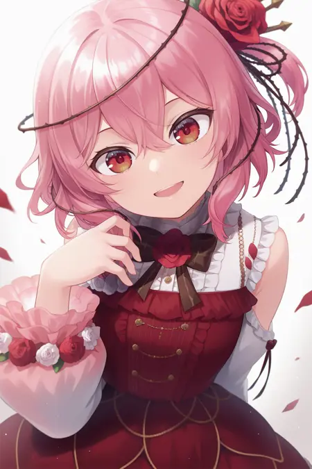 | 训练词汇 | RL1stHairstyle, RL1stCostume, short hair, pink hair, red eyes, hair flower, red dress, shirt, shoulder cutout, puffy long sleeves, white rose, green pantyhose, high heels已复制! RL3rdHairstyle, RL3rdCostume, long hair, pink hair, multicolored hair, drill sidelocks, high ponytail, red eyes, white headwear, hat ornament, hairclip, white coat, long sleeves, green sweater, lapels, black shorts, toeless footwear已复制! RLIdolHairstyle, RLIdolCostume, medium hair, pink hair, short sidetail, multicolored hair, red eyes, idol, mini crown, red rose, vest, sleeveless, white bowtie, armband, black gloves, asymmetrical gloves, black shorts, kneehighs, black footwear已复制! |
