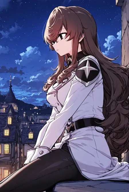 white uniform, black collar, high collar, cross motif, white coat, black cross emblem, long sleeves, tight pants, black pants, black boots, high heel boots,