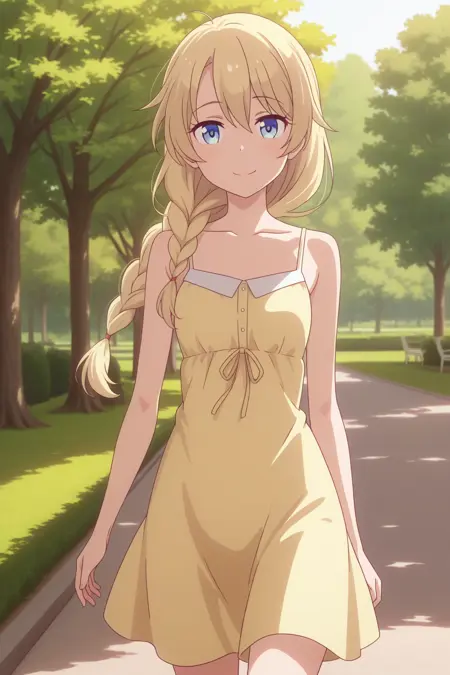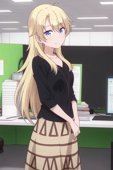 aakou, blue eyes, blonde hair, koudef, black shirt, sleeves past elbows, brown skirt, long skirt, print skirt,