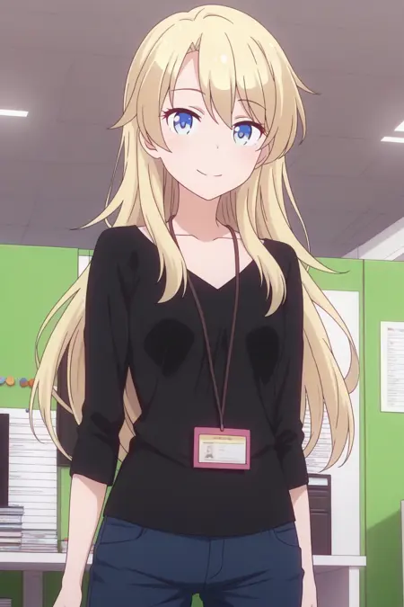 aakou, blue eyes, blonde hair, koudef, black shirt, sleeves past elbows, jeans,
