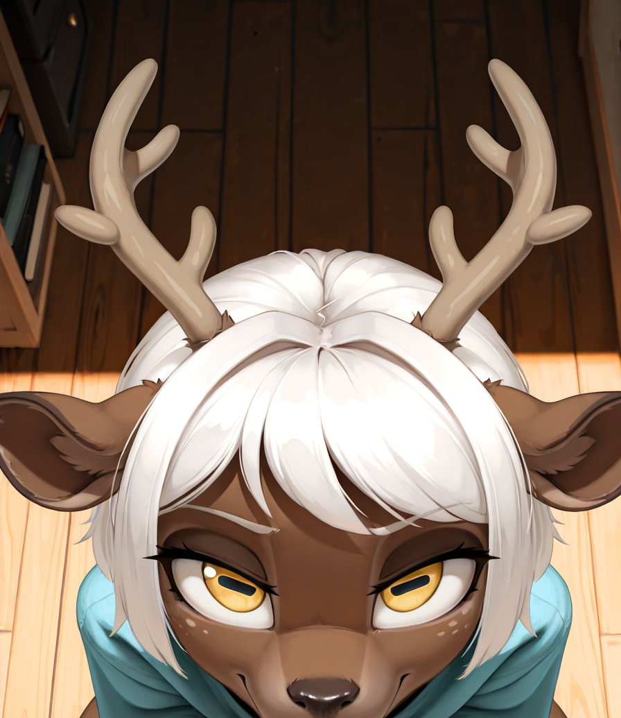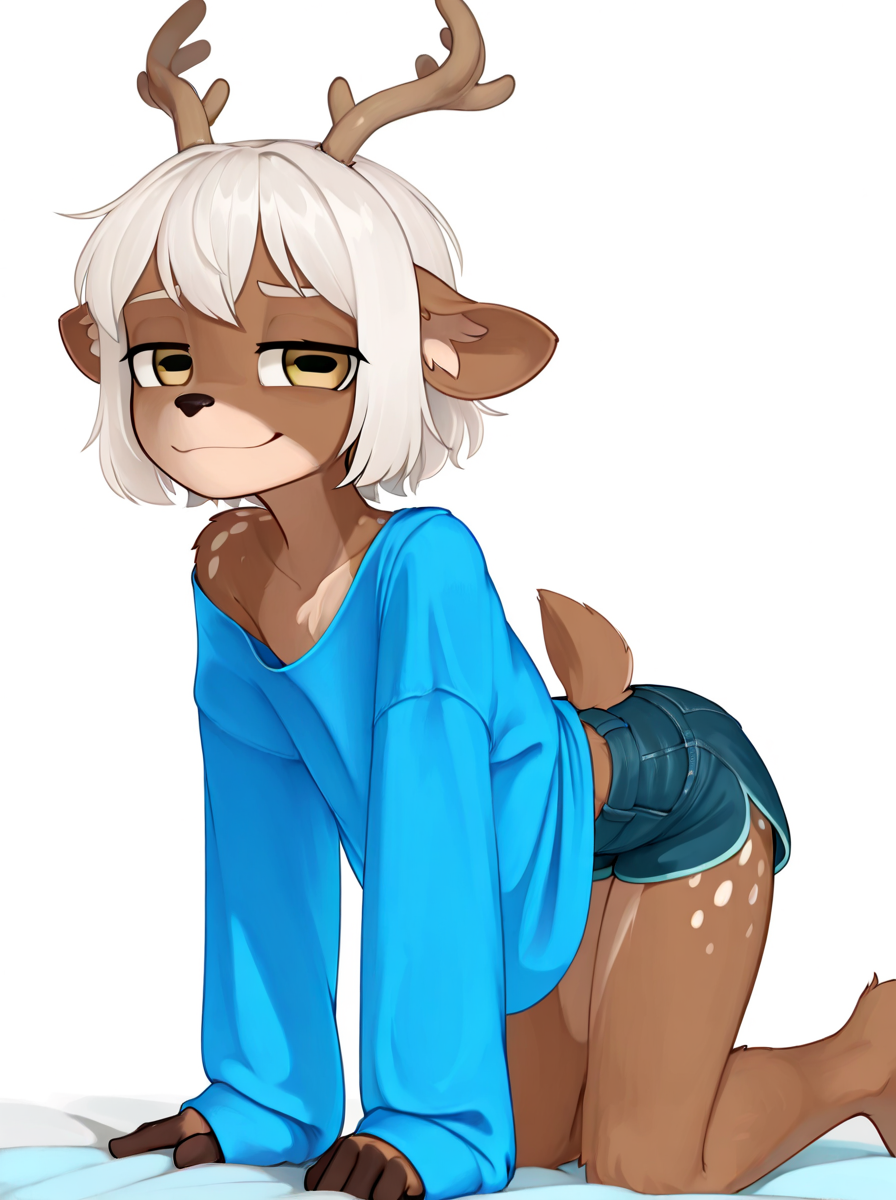 触发词:anthro、女性、鹿、鹿角、白发、短发、水平瞳孔、黄眼、棕色身体、纤细、平胸、 oversized 衬衫、短裤