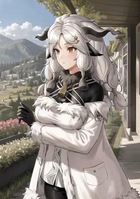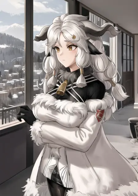 ,valais, black sheep ears, fur trim white sweater, fur trim white coat, cowbell, shirt, black gloves, fur trim