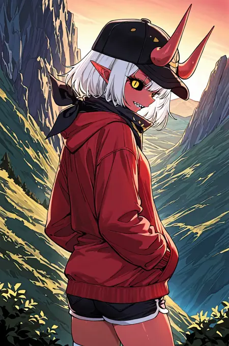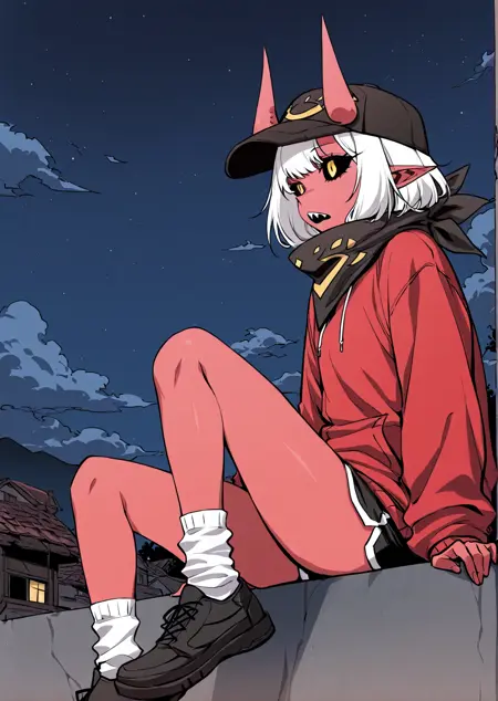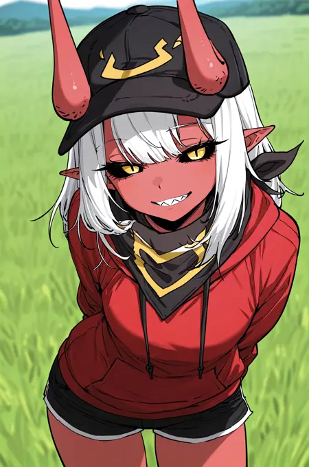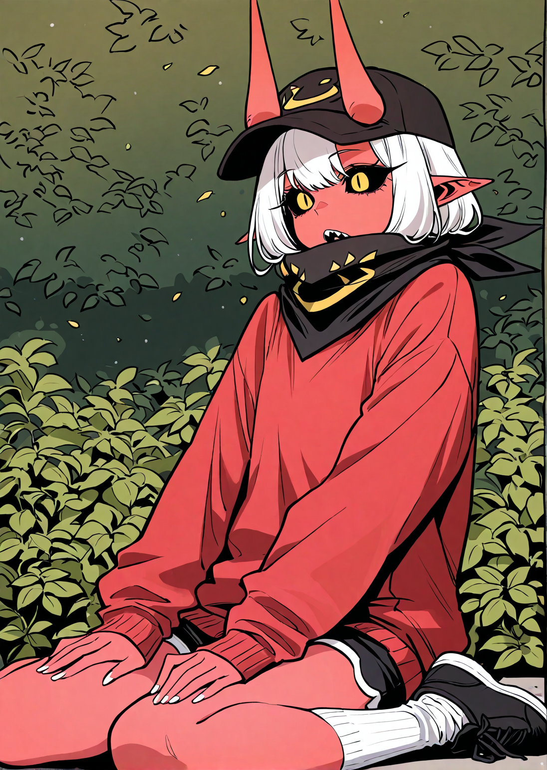 1girl, solo, dark red skin, short white hair, blunt bangs, asymmetrical bangs, yellow eyes, black sclera, slit pupils, long eyelashes, red horns, pointy ears, sharp teeth, black cap with red horns,