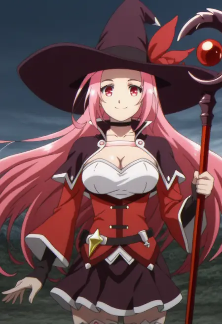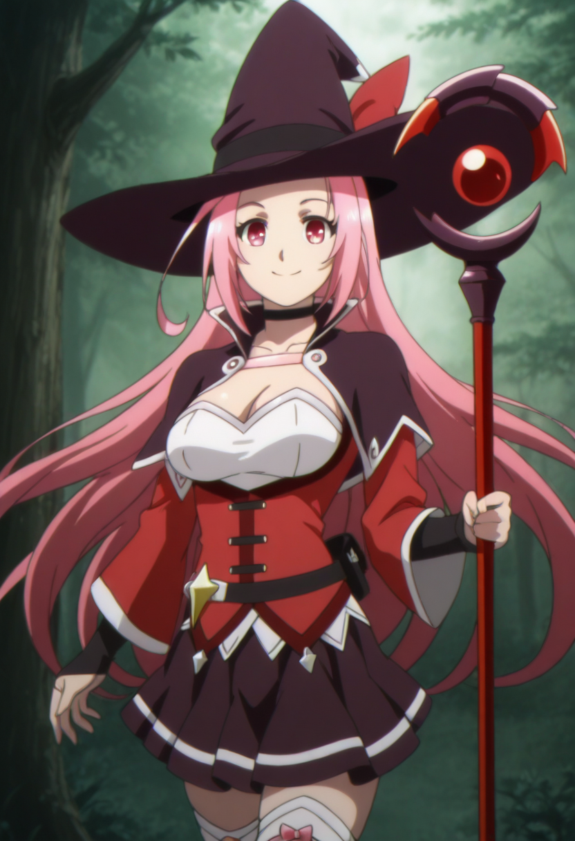 触发词 = zzcleozz,标签 = 粉色头发,长发,1个女孩,单独,帽子,女巫帽,项圈,胸部,乳沟,粉红色眼睛,微笑,法杖,手持,红色眼睛,看着观众,手持法杖,上半身,过膝袜,短裙,大胸部,呆毛,魔法少女