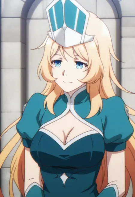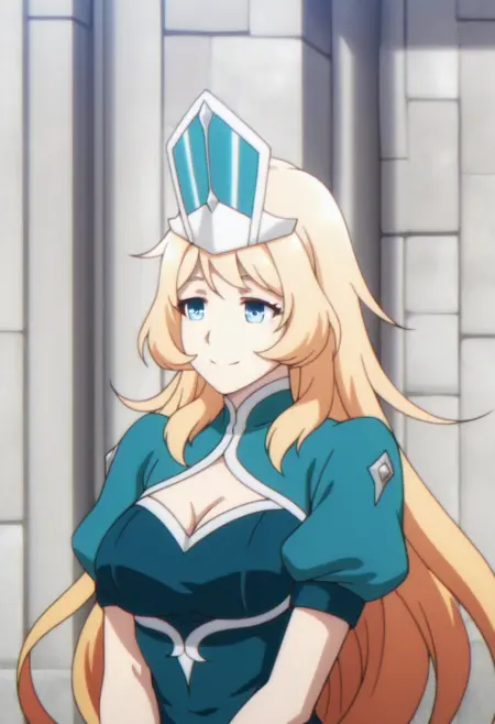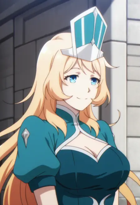 トリガー = zzfreyzz、タグ = 1girl, blonde hair, long hair, blue eyes, solo, breasts, cleavage cutout, short sleeves, hat, cleavage, clothing cutout, puffy sleeves, bangs, smile, dress,