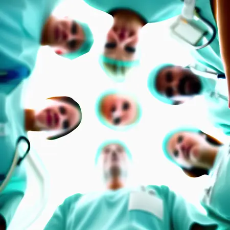 1boy, 1girl, multiple others, surgical mask, scrub cap, low angle, from below