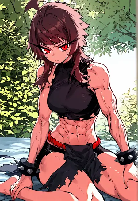 torn sleeveless top, black crop top, red rope belt, black shorts, long, spiked wrist cuffs, barefoot,