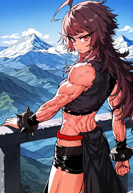 1 girl, solo, red eyes, long messy brown hair, side ahoge, pointed bangs, long side strands, muscular female, , long eyelashes, thick eyelashes,