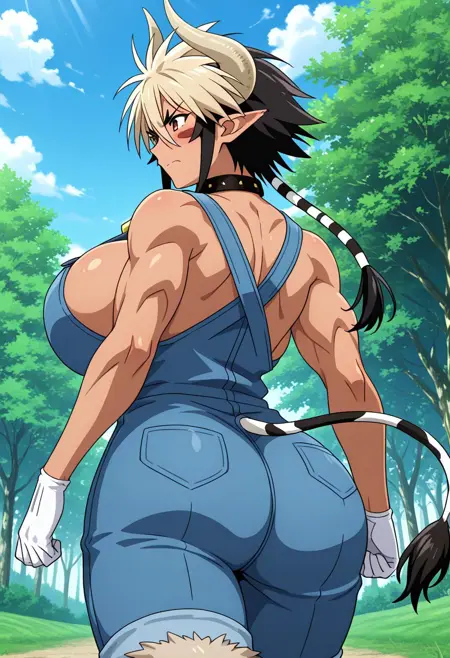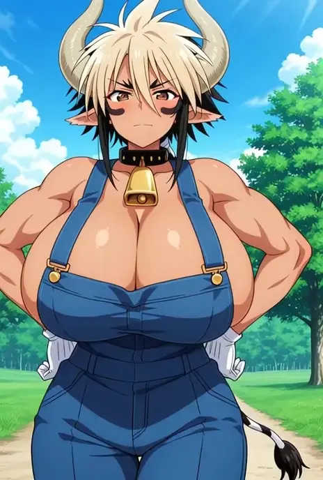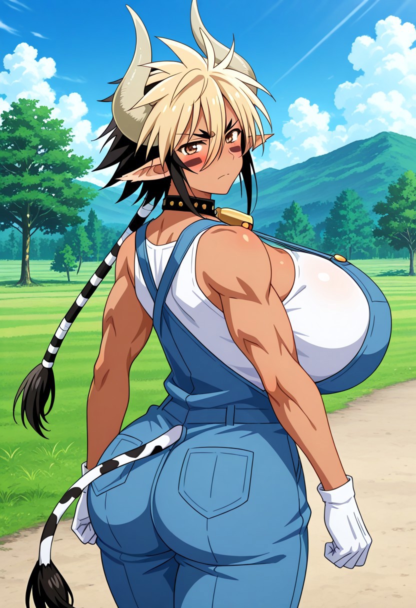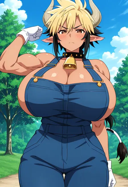 Cathyl, 1girl, solo, ((mature female:1.4)), ((adult woman, adult face)), horns, cow horns, neck bell, ((spiky hair)), (huge breasts:1.8), ((curvy)), ((wide hips;1.5)), hooves, denim overalls, narrow waist, cowbell, cow girl, cow tail, collar, multicolored hair, monster girl, dark-skinned female, pointy ears, animal ears, cleavage, blonde hair, two-tone hair, blue overalls, tall female, gloves, blush, cow ears, black hair, muscular, horizontal pupils, brown eyes, short hair, abs, white gloves, ((braid, long ponytail)), muscular, biceps, abs, toned body,