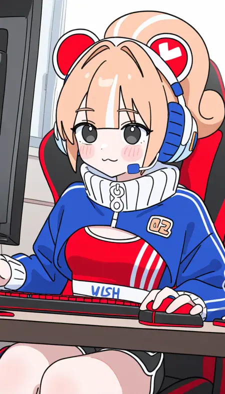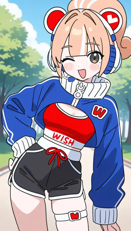 AddmiOutfit, blue cropped jacket with "01" printed, red sports bra with "WISH" printed, black dolphin shorts with red waist bow, white thigh strap, loose socks, sneakers, zipper, zipper pull tab, turtleneck
