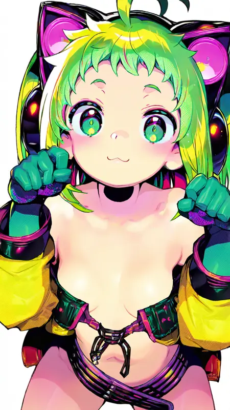 antenna \(dohna dohna\),ahoge,green hair,small breasts,animal ear headphones,long sleeves,thick eyebrows,layered sleeves,:3,shorts,purple jacket