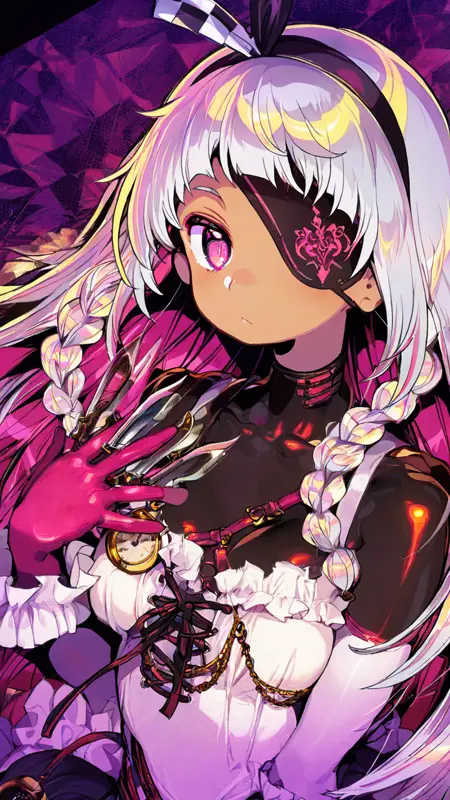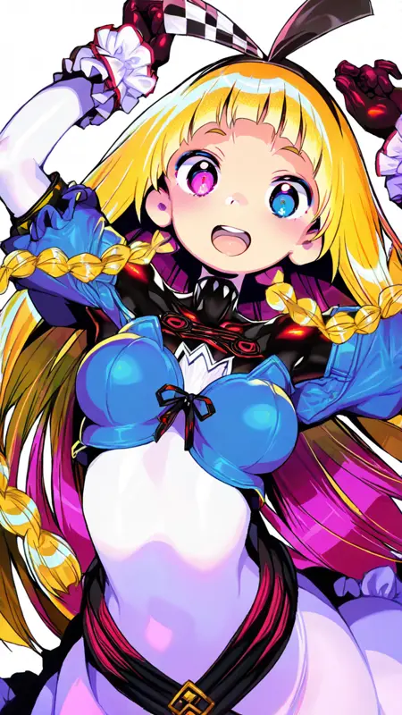 alyce \(dohna dohna\), long hair, blonde hair, dress, braid, latex pantyhose, black pantyhouse, latex gloves, twin braids, blue eyes, pink eyes,heterochromia, frilled dress, black gloves,blunt bangs, white dress,hairband,belt,pocket watch,bodysuit under clothes