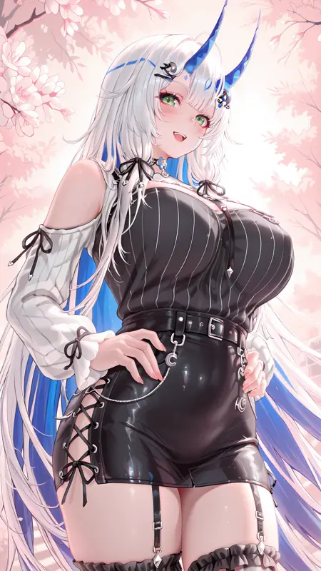 cslmdn,发饰,发夹,角饰,白色薄外套,竖条纹衬衫,露肩衬衫,黑色衬衫,衬衫塞入腰带,肩部开孔,长袖,扣带,吊带,荷叶边,黑色丝带,交叉系带短裙,皮质短裙,腰带,荷叶边长筒袜,大腿绑带,新月形配饰,银色配饰,花朵项圈