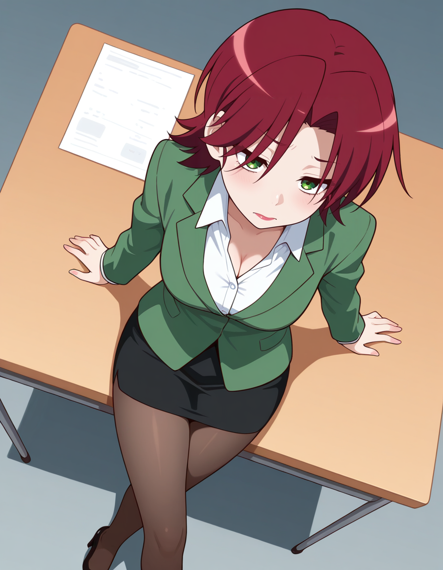 옷차림: 녹색 재킷, 흰색 셔츠, 연필 스커트, 팬티스타킹, 검은 힐