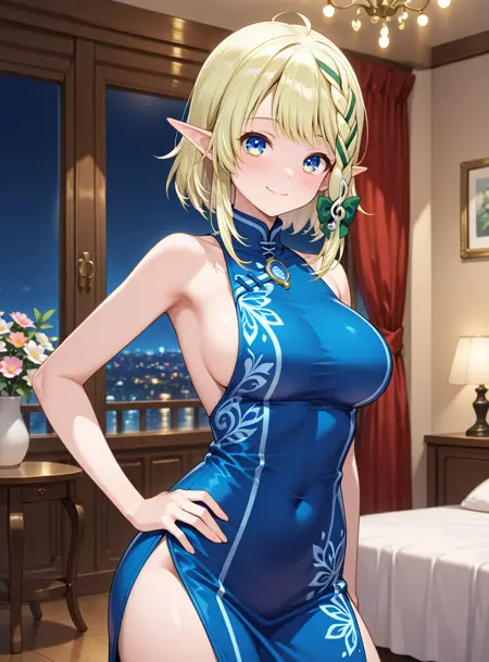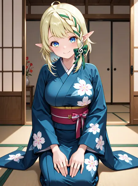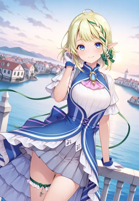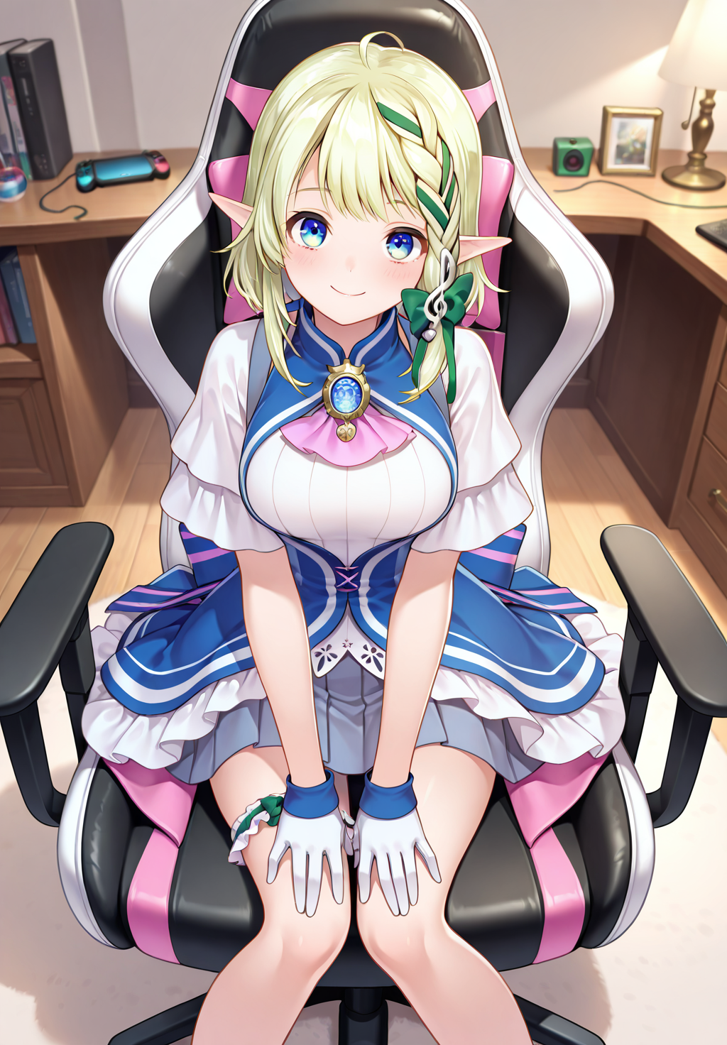 "Senjyou Aria, short hair, pointy ears, musical note hair bow,"
