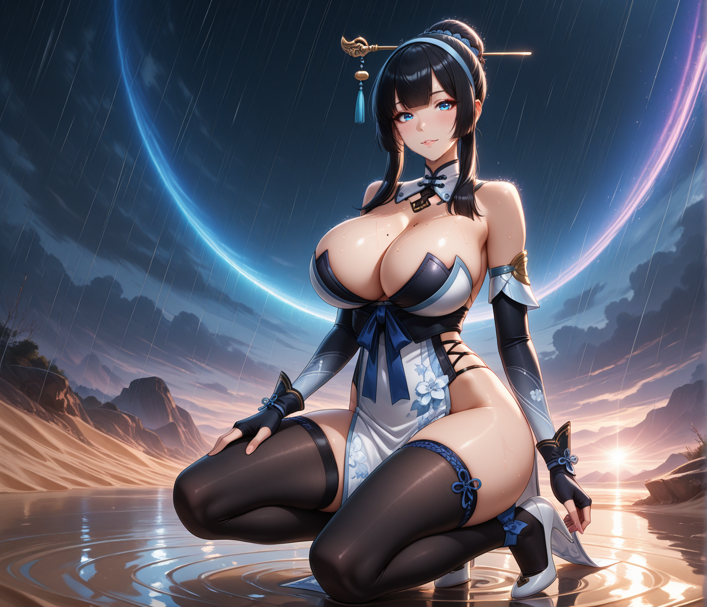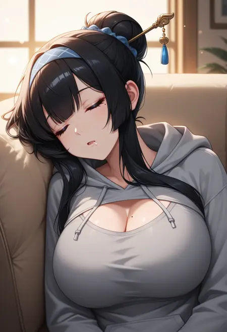 l4nxi, 검은 머리, 파란 눈, 머리 꽂이, 머리 장식, 머리띠, 단일 머리 땋기, 긴 머리, 옆머리, 앞머리, 가슴에 점, 큰 가슴,