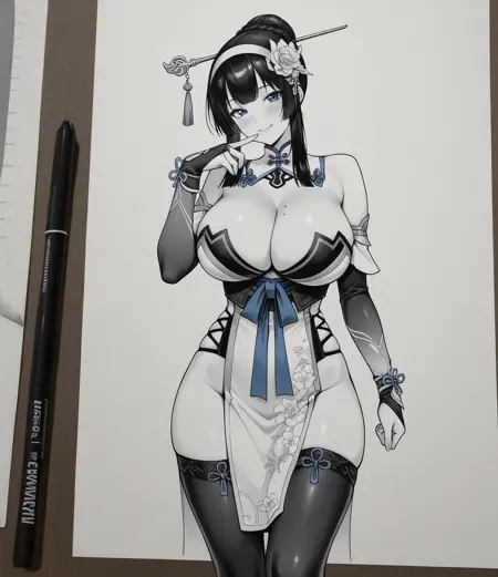 가슴 사이 틈, 벌어진 칼라, 어깨 드러남, 고레그 치파오, 허벅지 절개, 파란 리본, 꽃무늬 프린트, 손가락 없는 장갑, 분리된 소매, 검은 허벅지 스타킹, 골반 커튼, 몸에 딱 맞는 옷, 발목 끈, 흰색 하이힐, 리본 신발, 장식 신발,