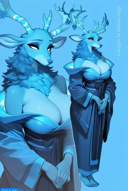1girl, Luna, anthro deer, animal ears, snout, horns, antlers, large breasts, blue sclera, blue body, glowing, kimono, earrings, jewelry, leaf horn ornament