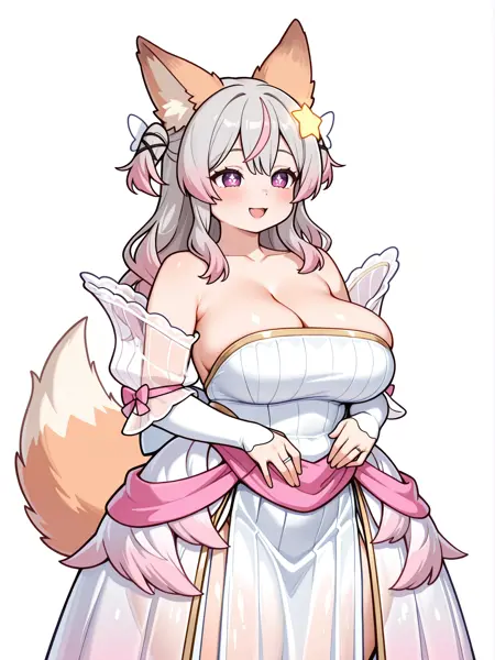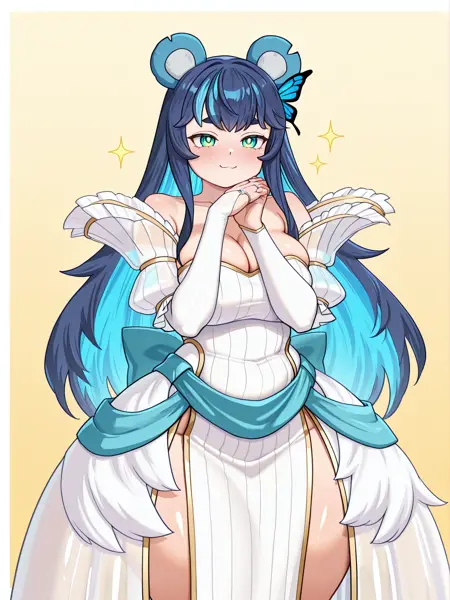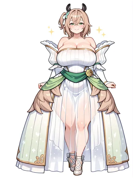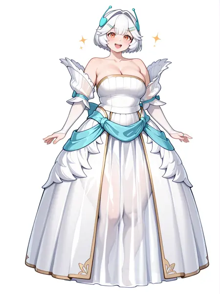 AwaBride, collarbone, strapless, bare shoulders, cleavage, back bow, ribbons, butterfly hair ornament, long dress, glowing dress, sparkling dress, shiny clothes, sash, white wedding dress, feather trim, detached sleeves, bridal gauntlets, gold trim, hobble dress, wedding ring,