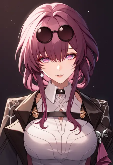 1girl, kafka_\(honkai:_star_rail\), eyewear_on_head, sunglasses, large_breasts, white_shirt, round_eyewear, purple_gloves, long_sleeves, black_jacket