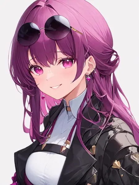 触发词:1girl, solo, shirt, pantyhose, eyewear on head, purple hair, jacket, sunglasses, purple eyes, white shirt,jacket on shoulders, breasts, black shorts, collared shirt, black jacket, necktie, bangs, boots,