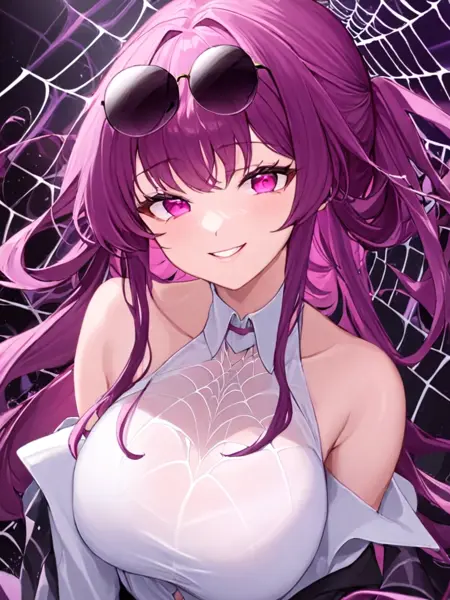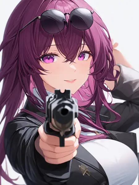 触发词:1girl, solo, shirt, pantyhose, eyewear on head, purple hair, jacket, sunglasses, purple eyes, white shirt,jacket on shoulders, breasts, black shorts, collared shirt, black jacket, necktie, bangs, boots,