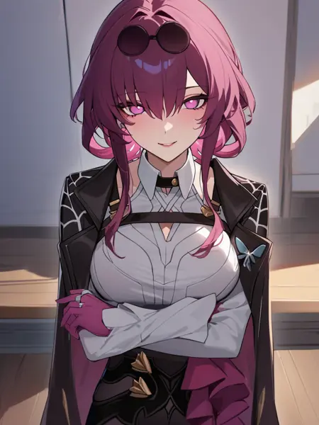 触发词:kafuka, shirt, pink hair, white shirt,long sleeves, skirt, collared shirt, jacket, black skirt,choker, coat, jacket on shoulders, round eyewear, black coat, black jac