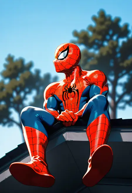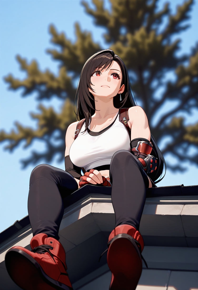 FHD14_KZ, foot_dangle, hands, blurry background, tree, roof, sky,