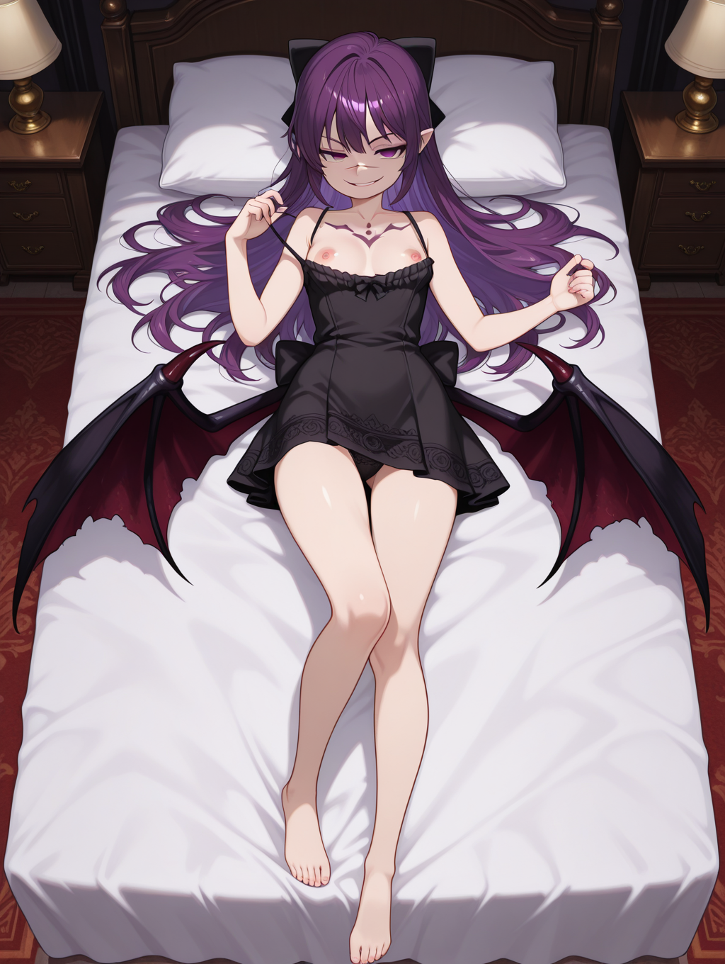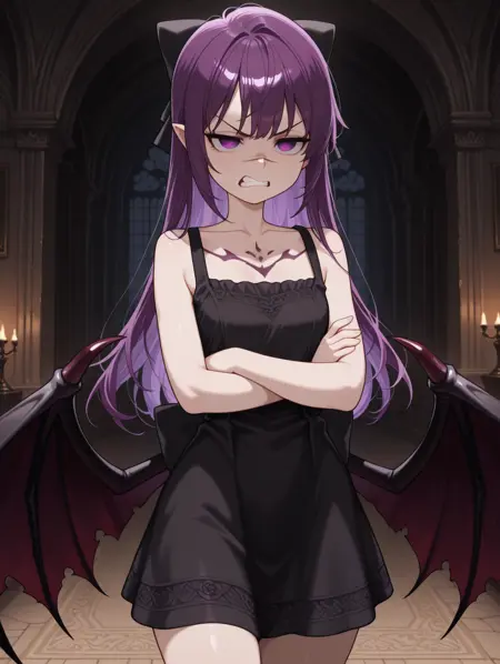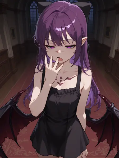 ShHecate、紫髪、長い髪、前髪、紫目、とがった耳、鼻の傷、胸のタトゥー、黒いドレス、髪のリボン、短いドレス、ノースリーブ、悪魔の翼、