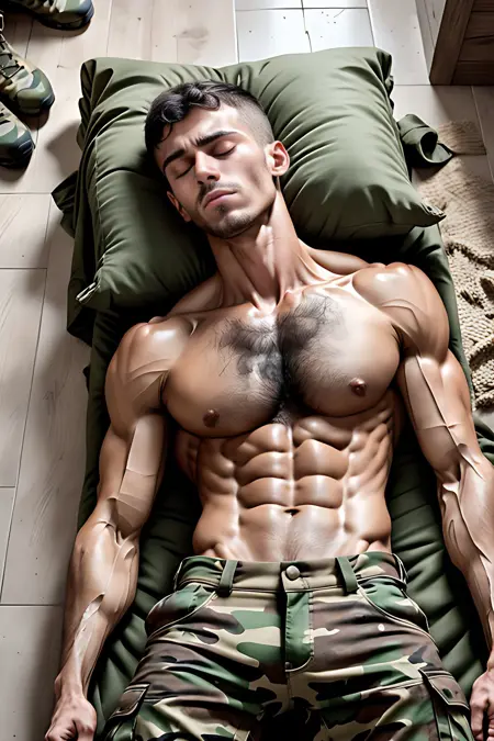 体格は男性モデルで、引き締まった筋肉質(ボディビルダーのように大きくなく)、V字体型、六つ割の腹筋など。勇敢な裸の兵士になるよう訓練済み 😉