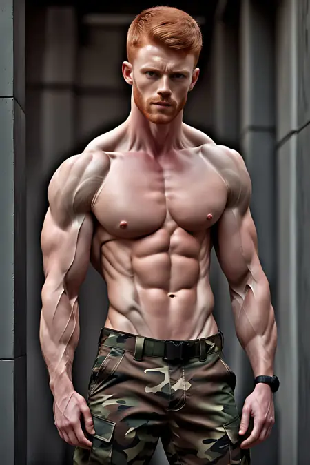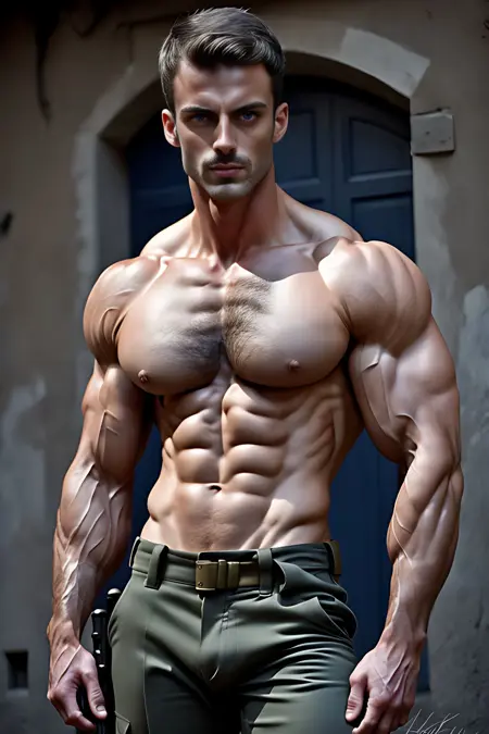 男性モデルで、体格は引き締まった筋肉質(ボディビルダーのような巨大ではなく)、V字体型、六パックの腹筋など。勇敢な裸体の兵士として訓練された 😉