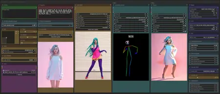 このワークフローにより、ControlNet(ポーズ/キャンニーや深度)を介して動画の動きを抽出し、ご希望の画像からその動きを用いて新しい動画を作成できます。