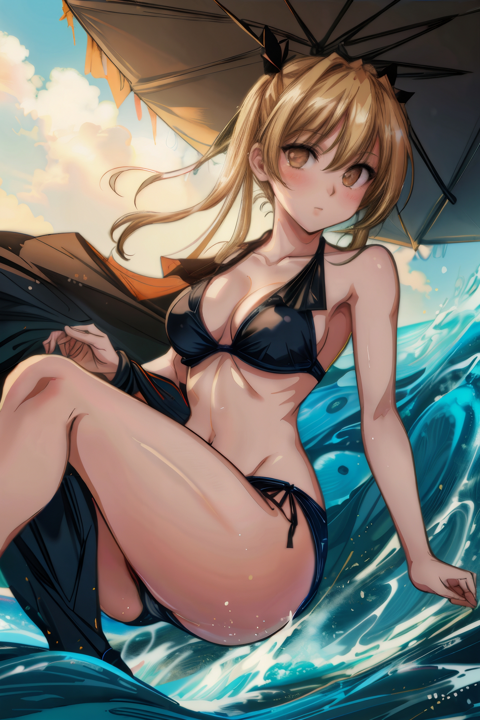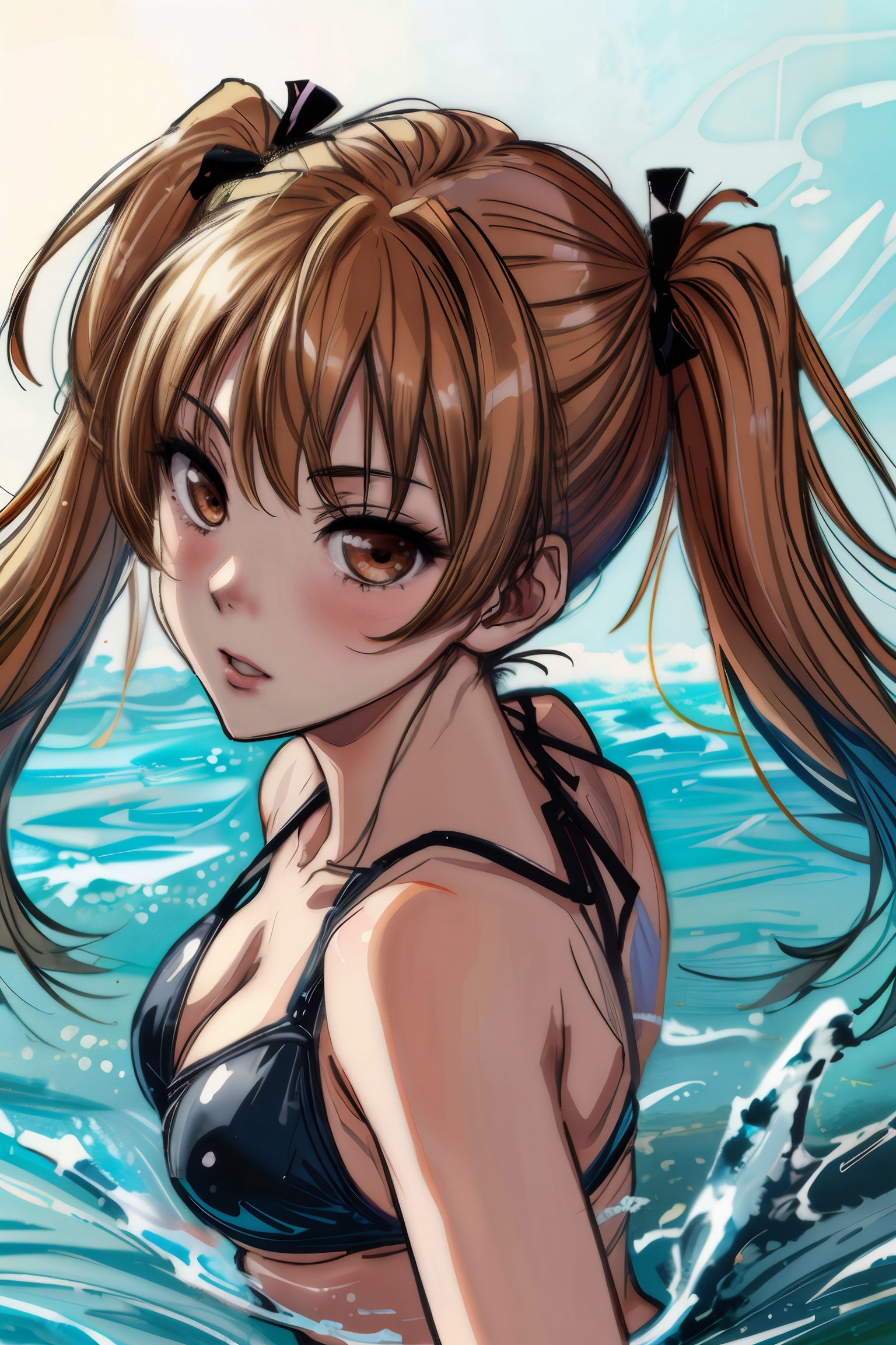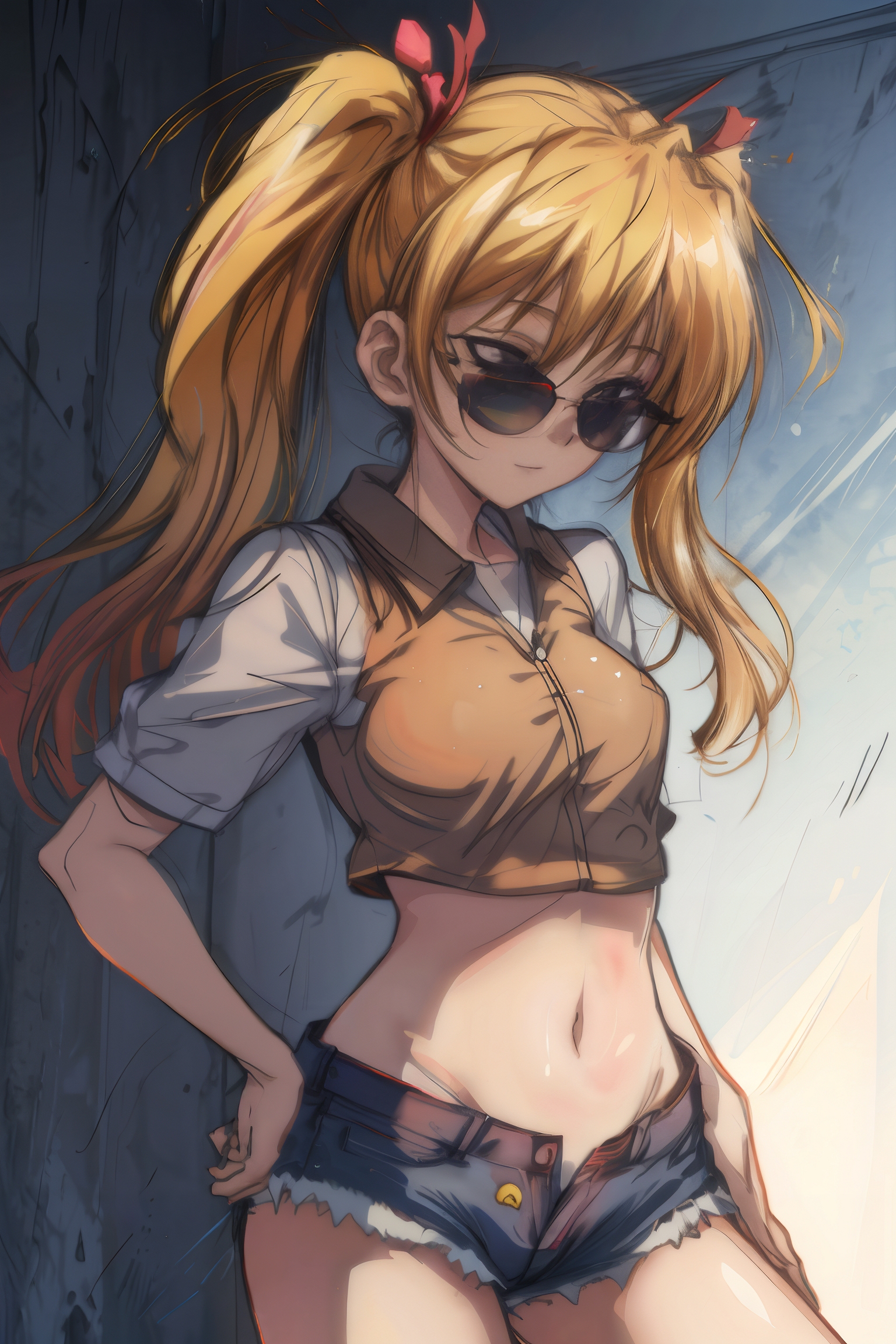 例のプロンプト: "sawachika_eri, an anime girl, 1girl, solo, smile, skirt, blonde hair, ribbon, twintails, brown eyes, school uniform, hair ribbon"