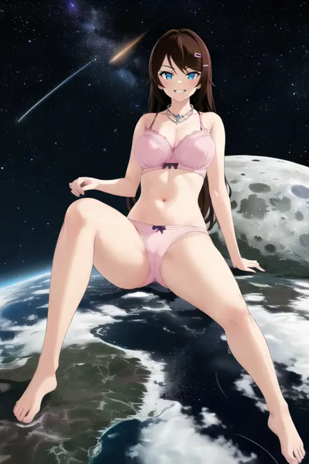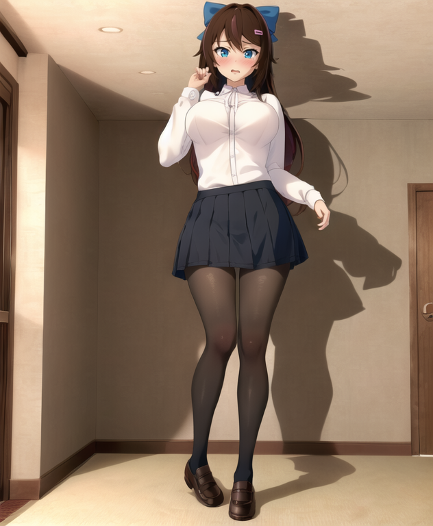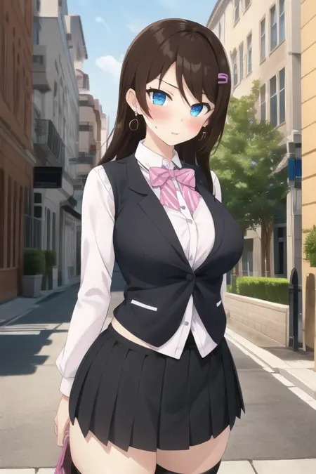14세 복장: 14y, 학생 소녀, 흰 셔츠, 검은 조끼, 주름 치마, 스타킹, 학교 신발, 분홍색 머리핀, 달 모양 귀걸이, 머리 리본