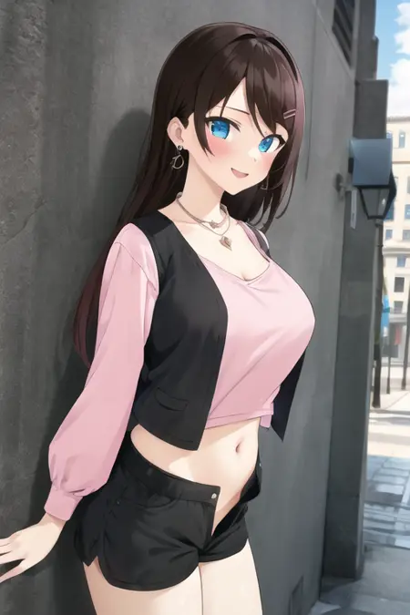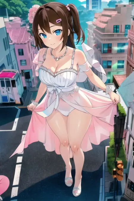 제8장 복장: chap8, 분홍 셔츠, 배꼽, 주름 미니 치마, 한쪽 스타킹, 흰 신발, 분홍색 머리핀, 회색 목걸이