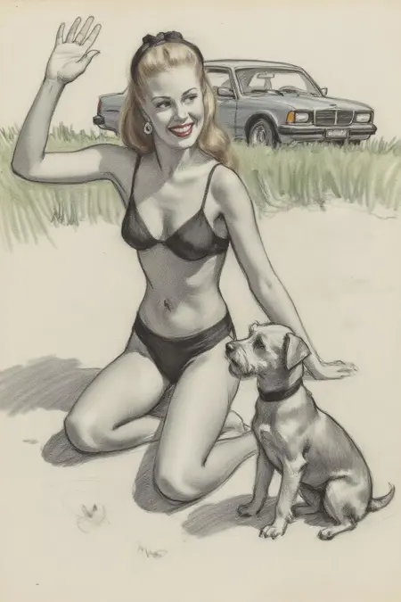 Caveat: despite the fact that the LoRA is named "Pouting Beauties" because Elvgren is famous for them, I actually prefer his illustrations where the women are NOT pouting. So this version was trained mostly "pouting free". I'll be training another version with images of women pouting their lips later.