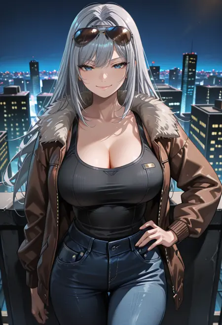 "ETHXC3, 회색 머리카락, 긴 머리카락, 머리카락 흐름, 앞머리, 파란 눈, 갑옷, 회색 코트, 검은 안셔츠, 가슴 부분 절개, 어깨 보호대, 긴 소매, 장갑, 십자가 모양 벨트, 테일코트, 검은 바지"