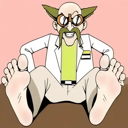 1boy, solo, bald head, two tufts of olive green hair, drooping mustache, olive green mustache, raised eyebrow, orange goggles, strapless goggles, lab coat, yellow undershirt, nametag, tan pants, barefoot, behind platform, one leg out, presenting foot, sole, wrinkled sole, hands on platform, body partially covered, looking at viewer, grinning, teeth, yellow background, vibrant colors, very detailed