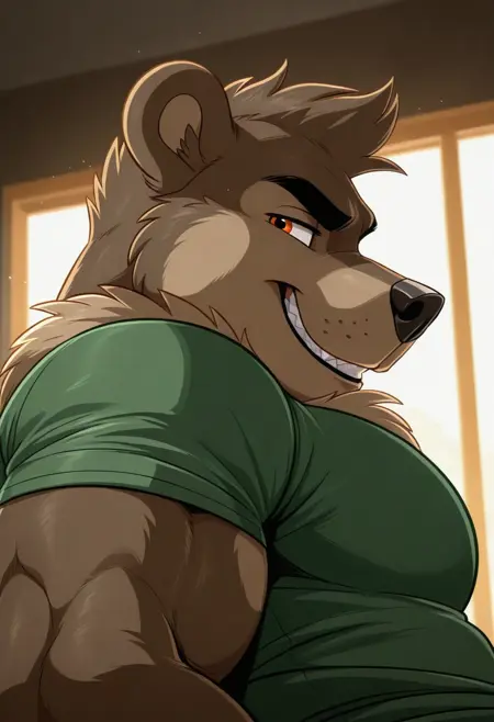 強化プロンプト: "bear boy, furry, orange eyes, muscular, manly, pectorals"
