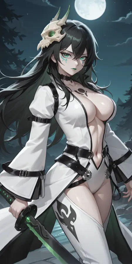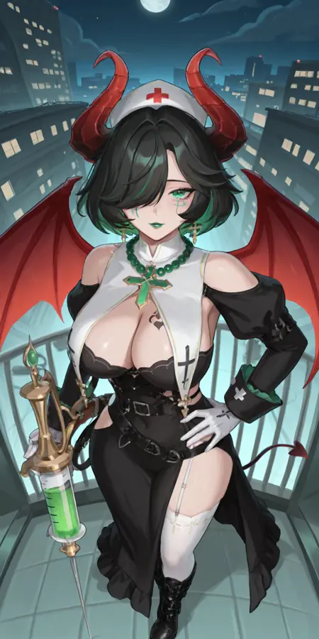 主要标签:obsidian,绿眼睛,黑发,极长发/短发,头骨发饰,双眼下方印记,苍白皮肤,绿色嘴唇,恶魔角,恶魔翅膀,绿色/红色角,绿色/红色翅膀。