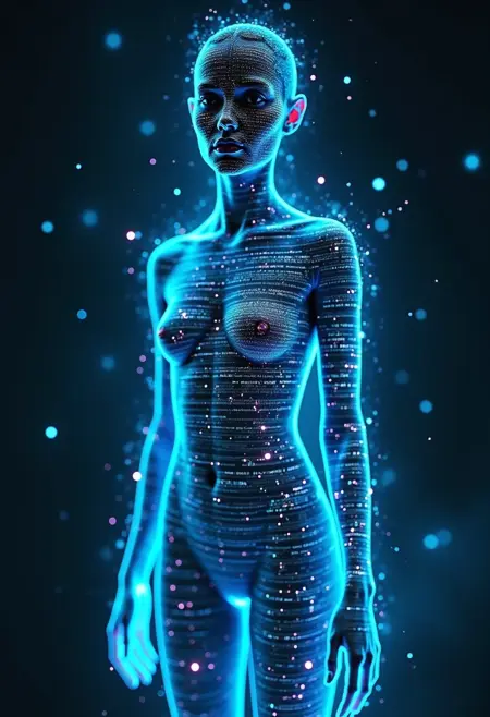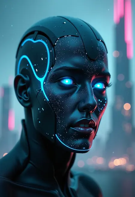 コンピュータコードの行とシームレスに統合された、不思議で未来主義的な人間の顔の肖像を生成してください。顔は有機的かつデジタルな外観で、人間性と技術の境界を融合させるべきです。顔の詳細:顔は幻想的で表現力豊かで、流れ込む髪、やさしい目、控えめな笑みや思索的な表情などの自然な特徴を持ちます。肌の質感は、顔の構造(鼻、頬、額など)を形成する輝くコードのラインへと移行します。目は特に印象的で、一方の目は従来の人間の虹彩のようであり、もう一方の目はバイナリ行列やアルゴリズムパターンに置き換えられます。コンピュータコード要素:Python、JavaScript、C++などの言語で書かれた実際のコード行を使用して、顔の一部を構成してください。たとえば:コードの断片が唇やあごの輪郭を形成する。変数や関数が髪や眉を織りなす。条件文(if/elseなど)が顔の対称性を形作る。コードは淡く輝き、光り輝き、まるで生きているような質感を持つべきです。