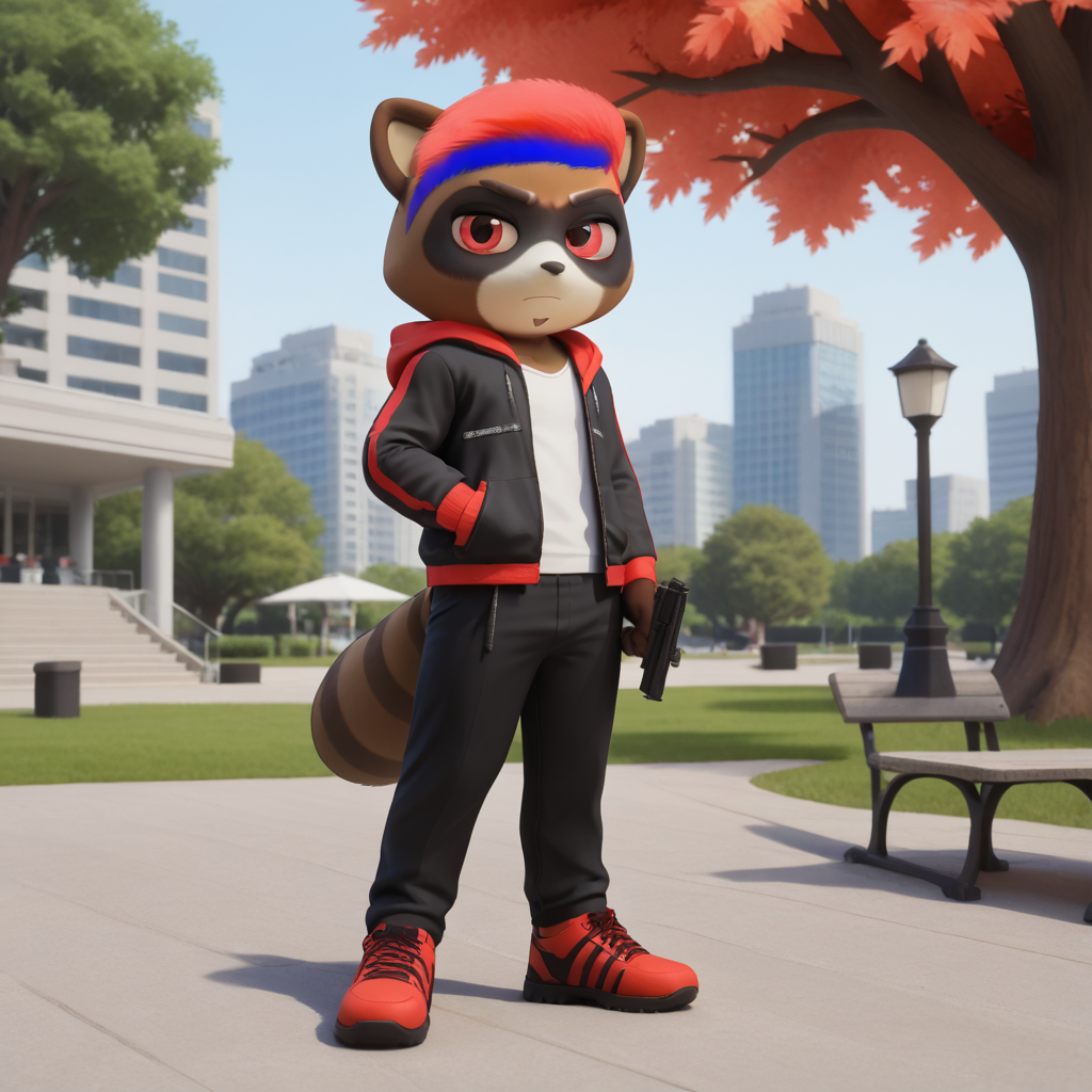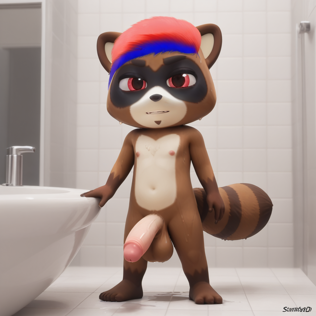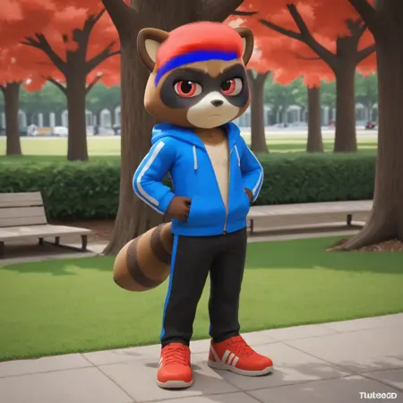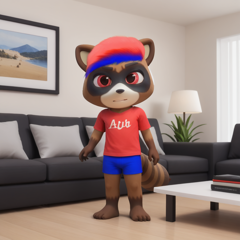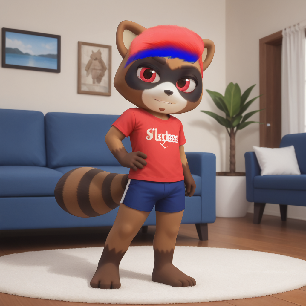 solo, 1boy, 3d, red eyes, animal ears, blue hair, tail, male focus, multicolored hair, red hair, furry, furry male, raccoon ears, raccoon tail, two-tone fur,