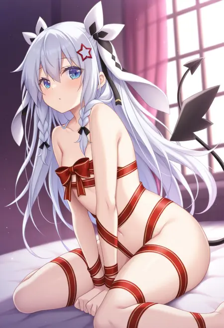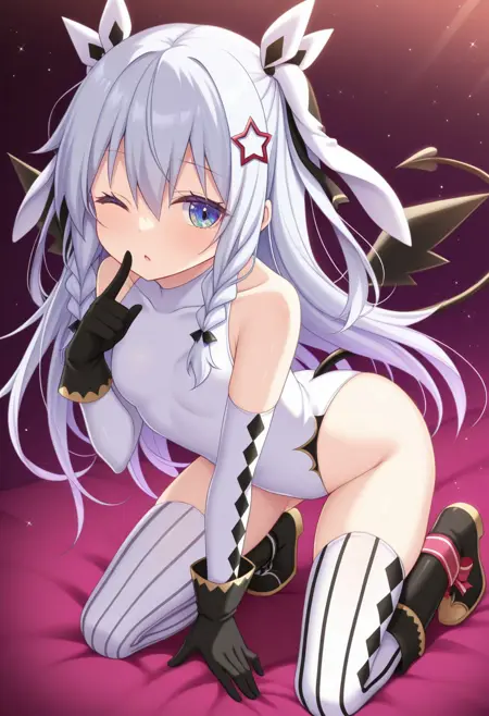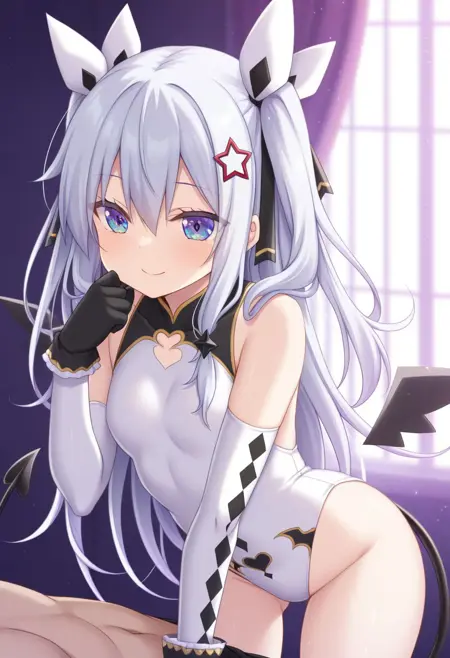 1 girl, SonyaSankai, 흰 머리, 긴 머리, 옆머리 땋기, 쌍둥이 땋기, 파란 눈, 눈에 별, 별 모양 머리 장식, 머리 리본, 작은 날개, 악마 꼬리,